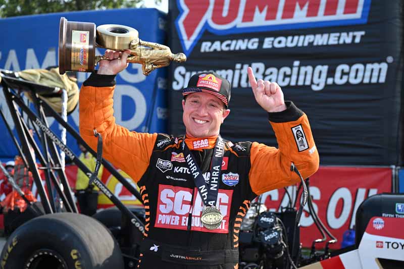 Ashley led from start to finish against Langdon, posting a 3.745-second run at 329.34 mph in his dragster to earn his 14th career win. The victory, Ashley’s first since April, moved him to third in the points standings.