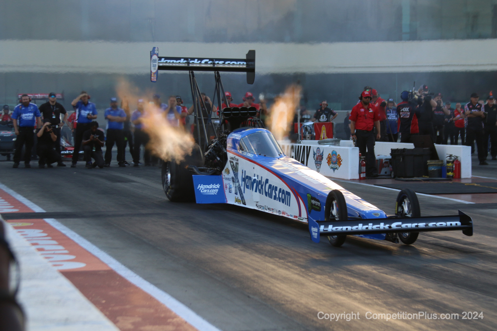 Points leader Austin Prock finished second in Funny Car with a run of 3.833 seconds. His teammate, Jack Beckman, is third at 3.850 seconds.