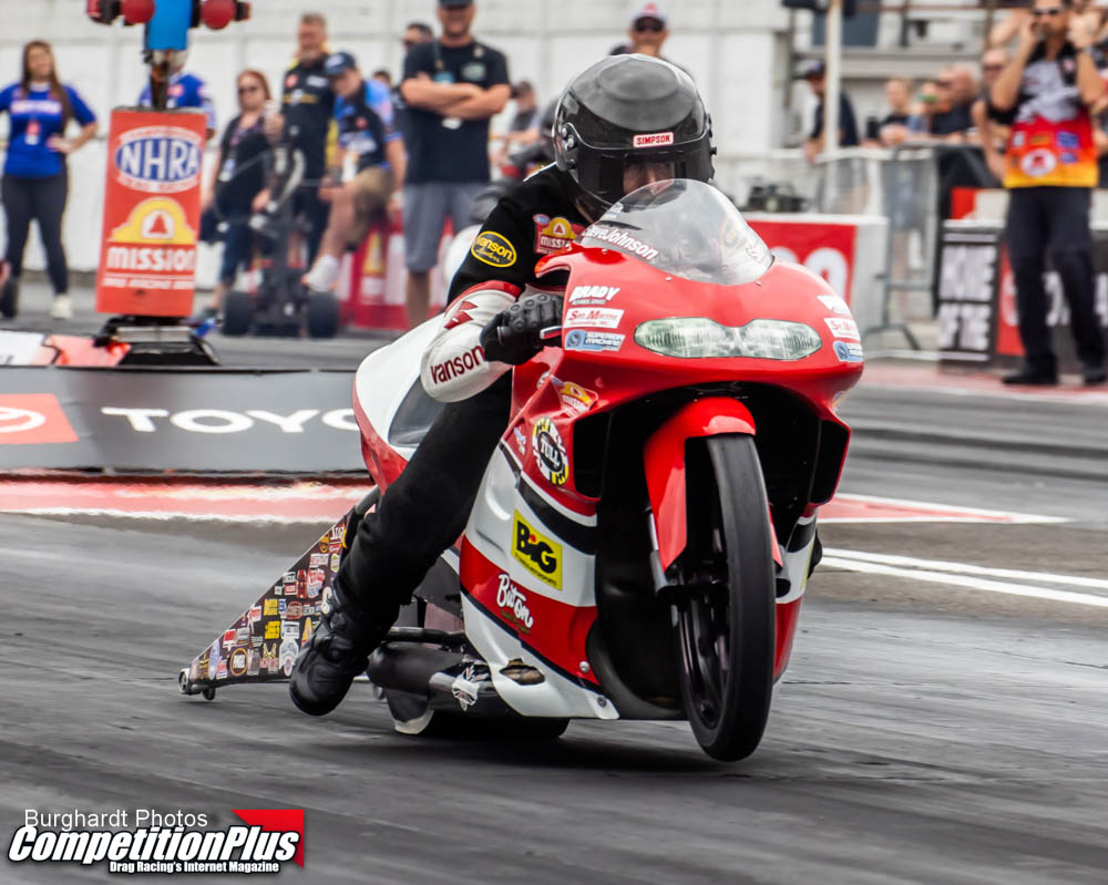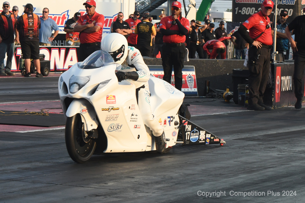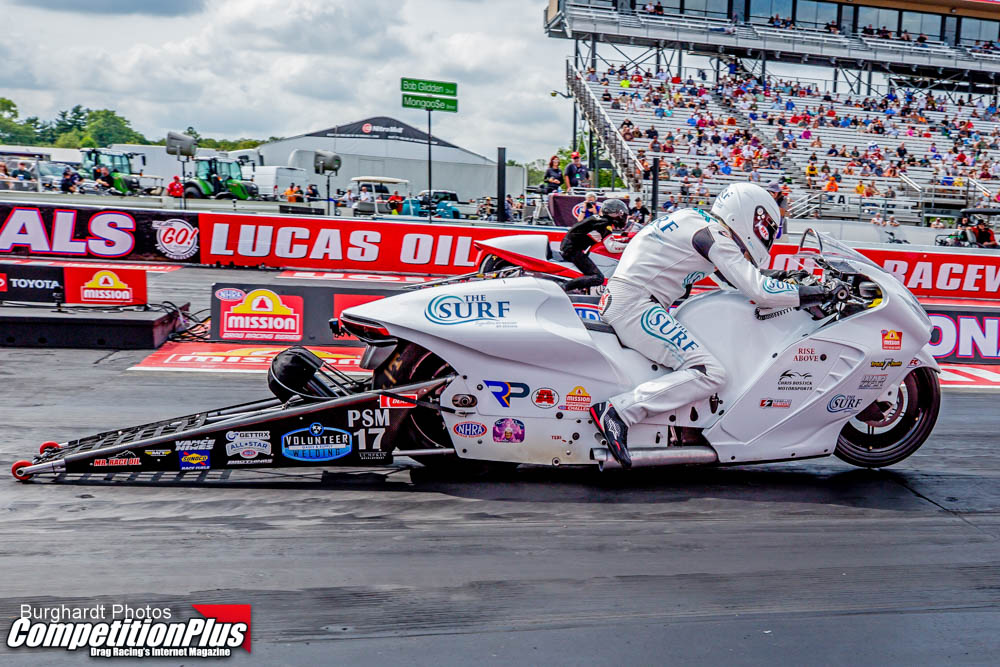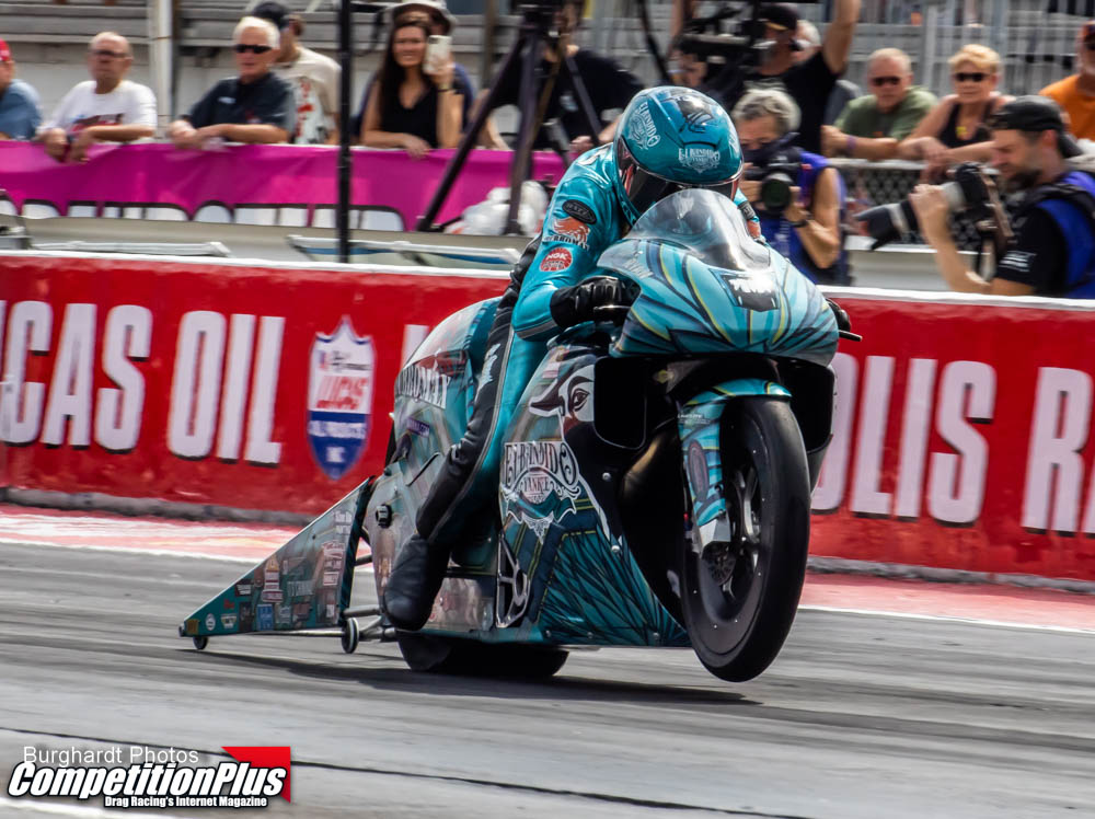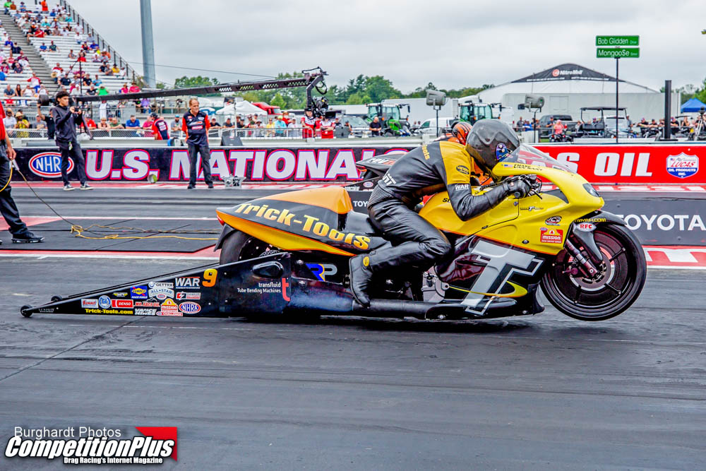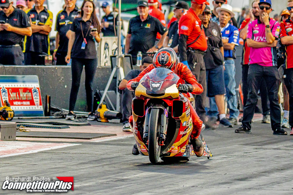 8 – OUTSIDE LOOKING IN NOT AN ISSUE – After Friday’s first round of qualifying at the U.S. Nationals all the Pro Stock Motorcycle competitors were in the field.