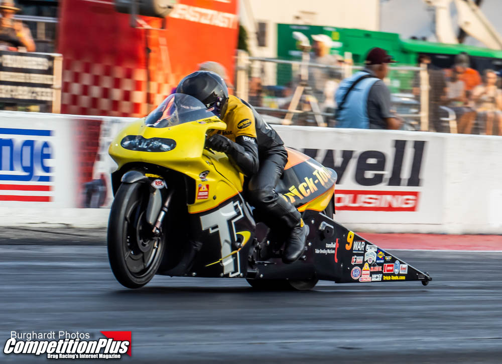 Tornow arrived in Indy aboard his Buell. He clocked a 7.141-second run at 188.33 mph, placing him No. 13 on the ladder.
