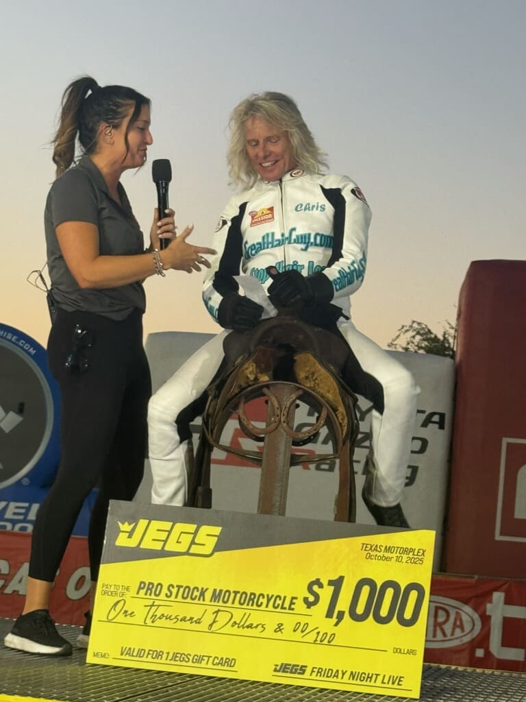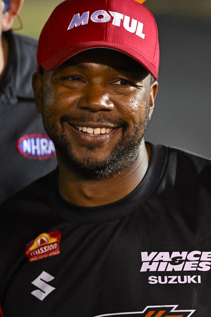 4 – THE GADSON SWAGGER IN FULL EFFECT – Richard Gadson strengthened his grip on the Pro Stock Motorcycle points lead Friday night, riding his RevZilla/Motul/Vance & Hines Suzuki to the provisional No. 1 spot with a 6.747-second pass at 201.59 mph at the Texas NHRA FallNationals. The performance earned him a $5,000 “JEGS Friday Night Live” bonus and his second No. 1 qualifier of the season.