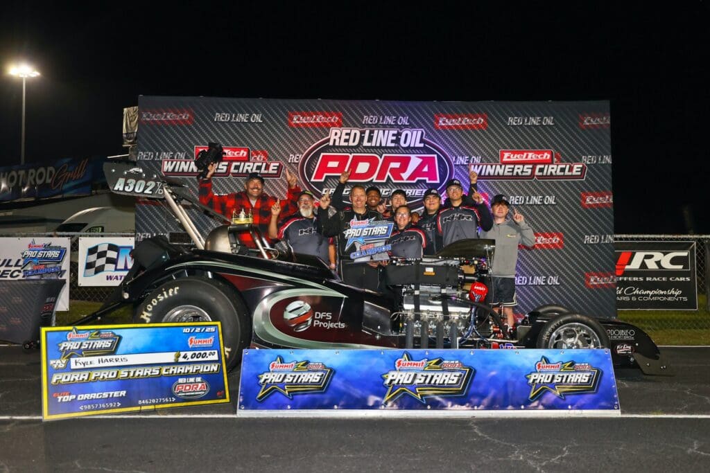 8 – HARRIS WINS TOP DRAGSTER – Kyle Harris, the defending Elite Top Dragster world champion and current points leader, scored a ProStars victory over two-time champion Steve Furr in a tight final-round matchup. Harris, driving his supercharged DFS Projects ’32 Bantam Altered, cut a .002 reaction time to Furr’s .004 and ran a 3.74 on a 3.73 dial-in for the win.