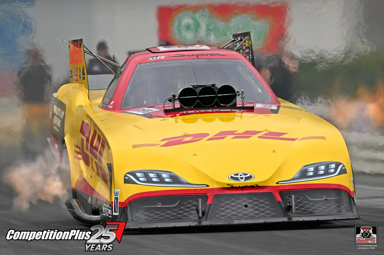 Prock, the defending event champion, made the quickest run in Funny Car history during Friday’s final qualifying session, stopping the timers in 3.791 seconds at a speed of 331.53 miles per hour. The run exceeded the previous mark held by the driver he subbed for, Robert Hight, who ran 3.793 seconds back in 2017 during the laid-back header era.