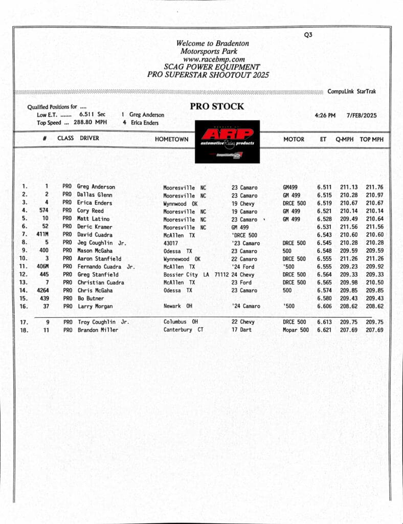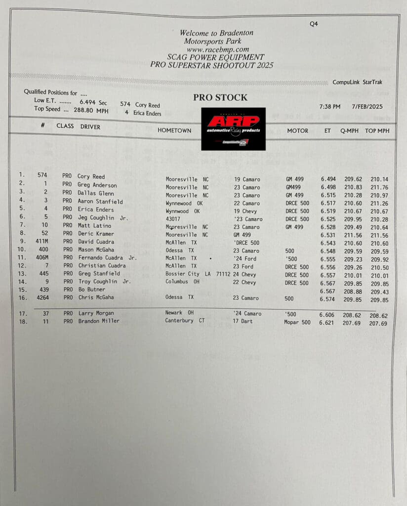The Pro Stock division is provisionally led by Dallas Glenn, who ran a 6.515, 210.28 to drive around Erica Enders’ 6.519, 209,67.