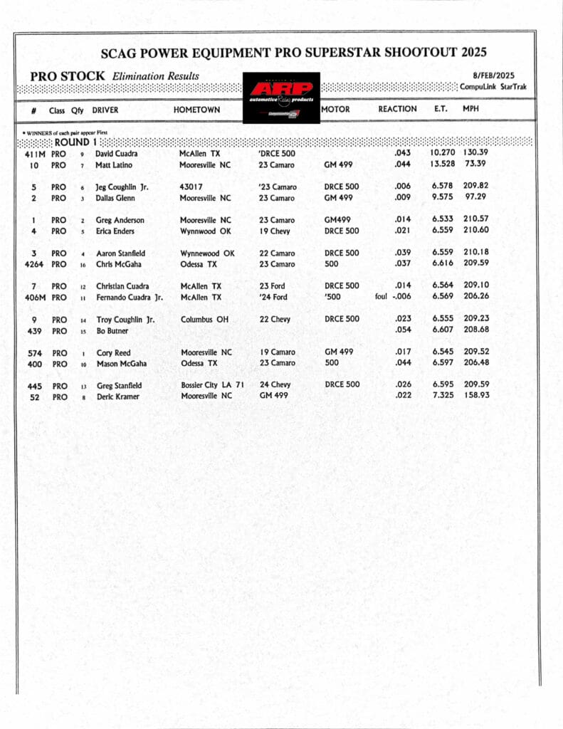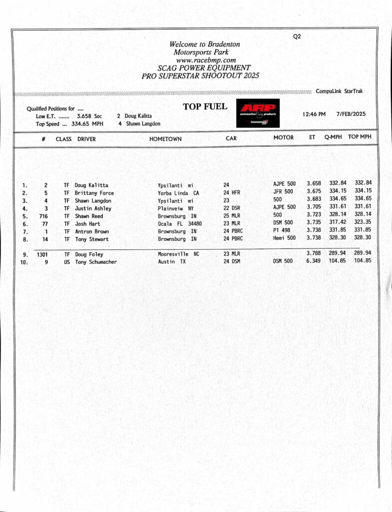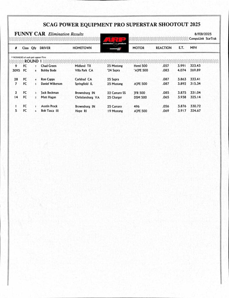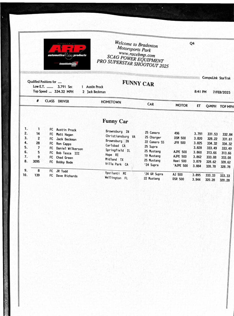 Antron Brown, Austin Prock, and Cory Reed topped qualifying at the 2nd annual SCAG Power Equipment PRO Superstar Shootout, showcasing some of the fastest times in the event’s history. Brown recorded a career-best 3.644 seconds at 322.11 mph in Top Fuel, while Prock posted a remarkable 3.791 seconds at 331.53 mph in Funny Car.
