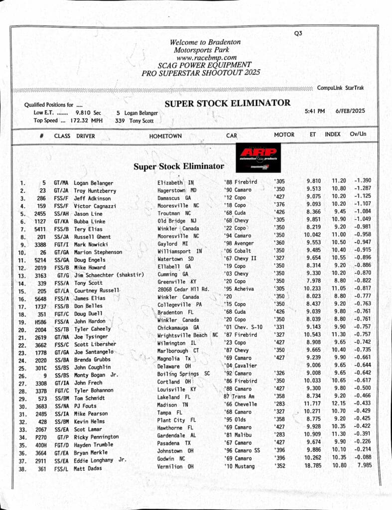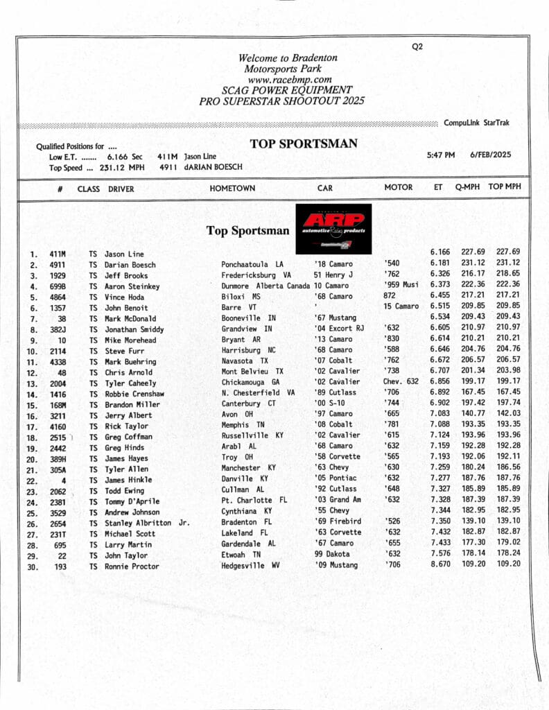 Gates open at 8 a.m. at Bradenton Motorsports Park, and the first round of eliminations is set to begin at 12:30 p.m.
