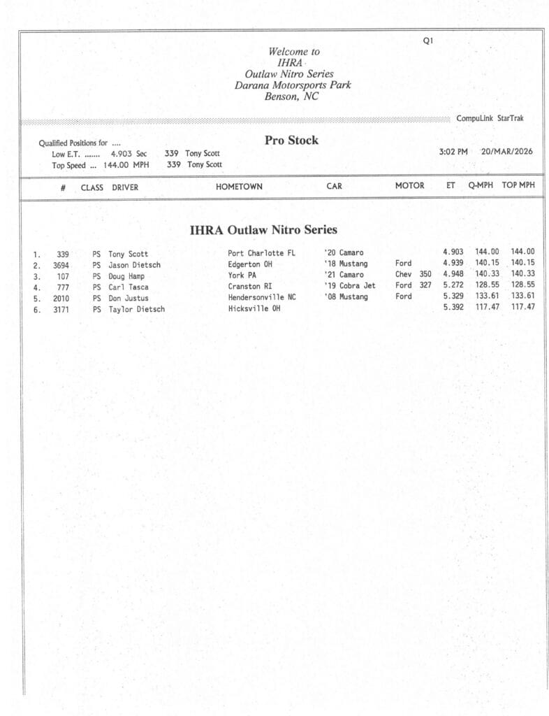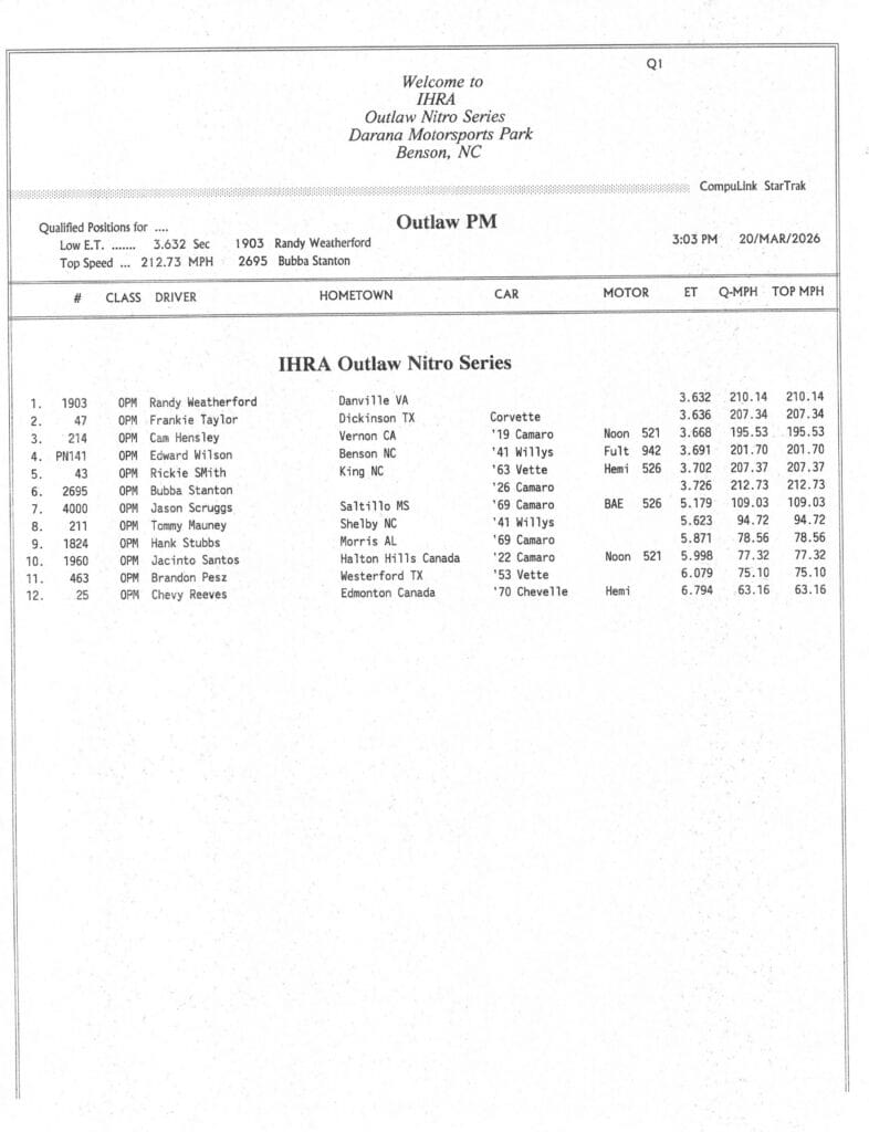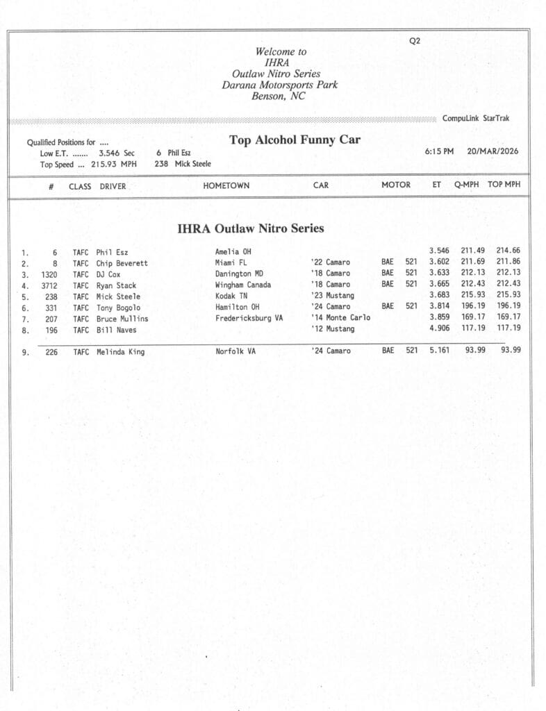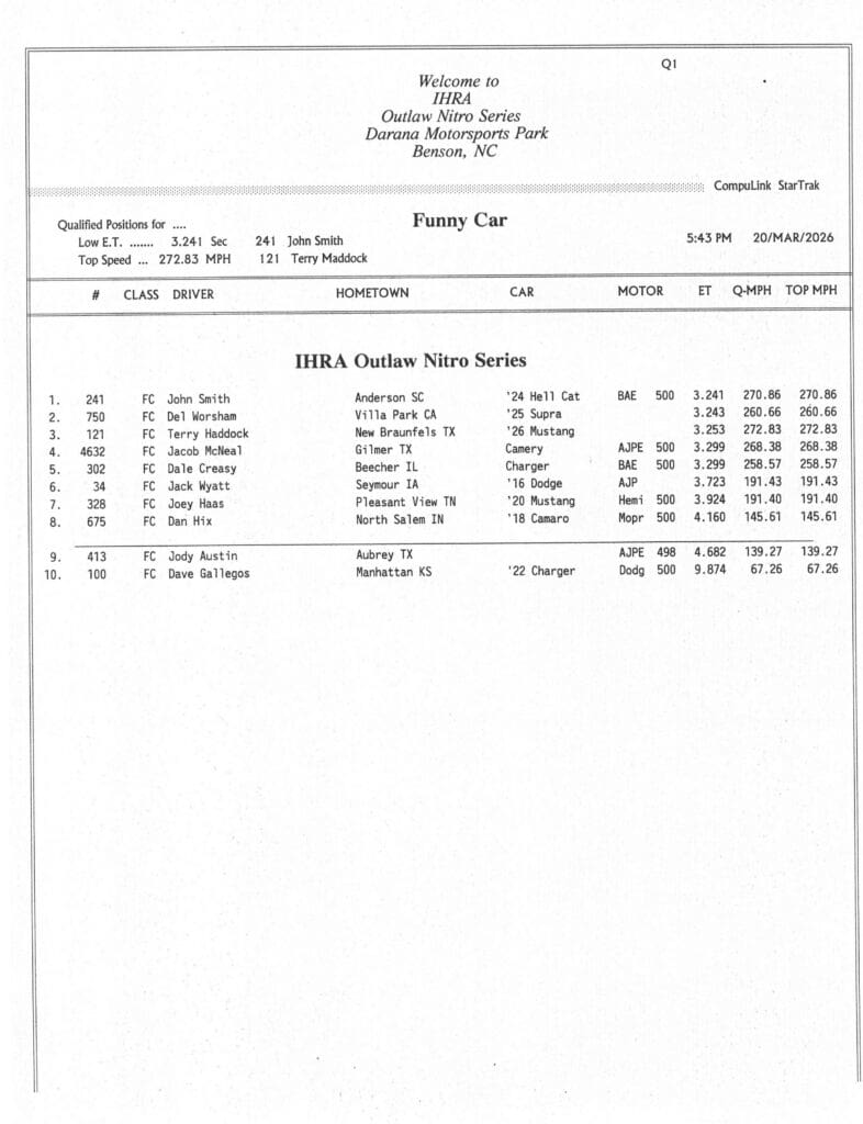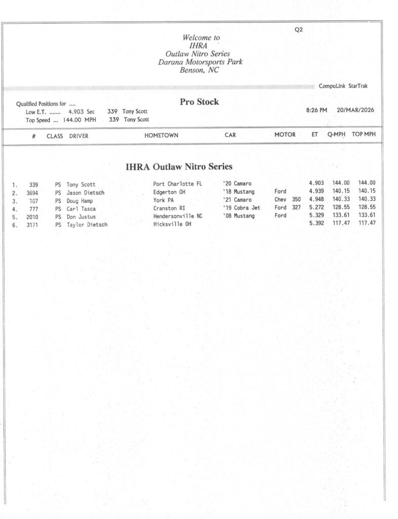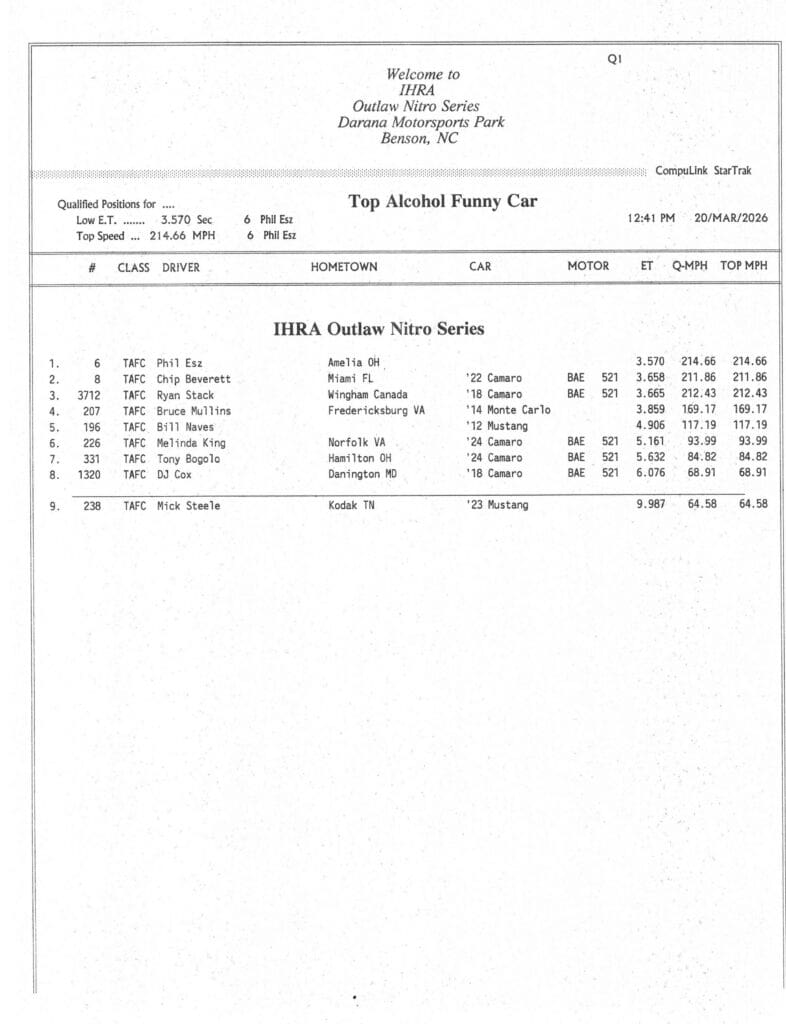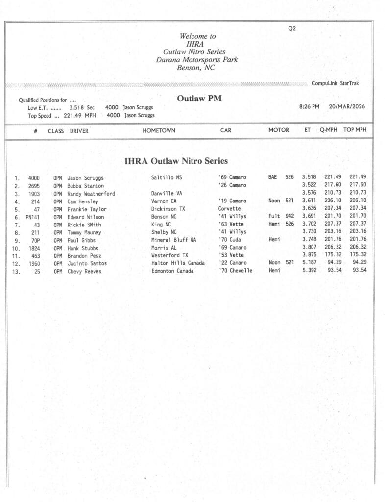 Elijah Morton claimed the final qualifying berth with a 4.100, completing a tightly contested field that promises high-stakes eliminations. The depth of entries reinforced the category’s continued growth within the IHRA structure.