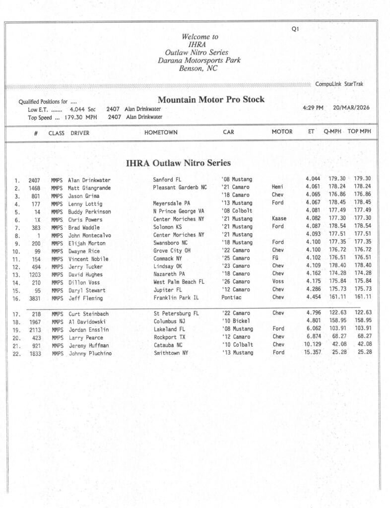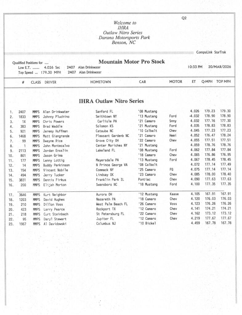 The Mountain Motor Pro Stock category featured the largest field of the event, with 23 entries competing for 16 qualifying positions. Alan Drinkwater seized the top spot during the final session with a 4.026 at 179.23 mph.