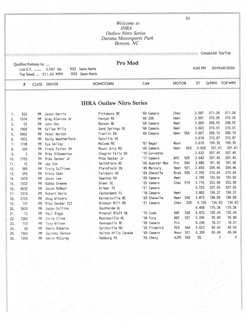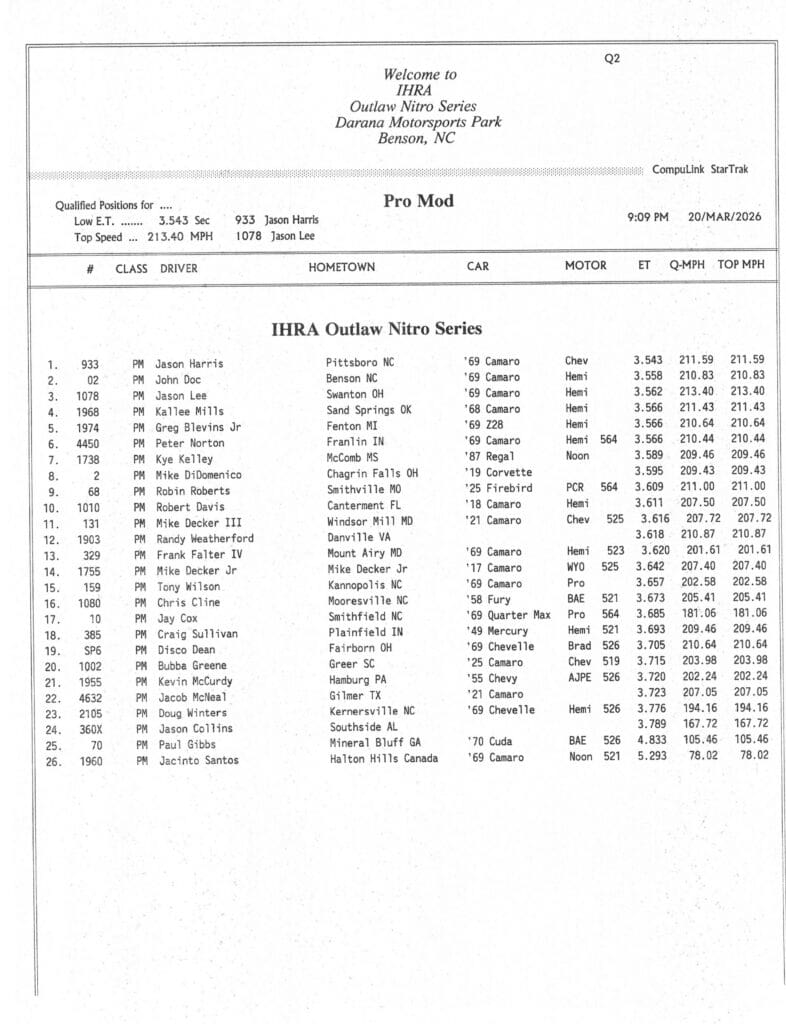 In Pro Modified, multi-time PDRA Pro Boost champion Jason Harris set the pace with a 3.543-second run. Harris narrowly edged John Doc, who followed with a 3.558, while Jason Lee secured third at 3.562.