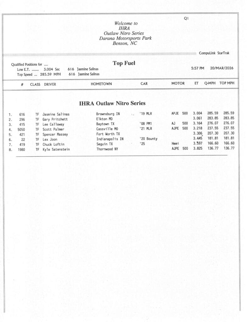 Salinas, a second-generation Top Fuel driver, thundered to a 3.004-second pass at 285.59 mph to claim the first No. 1 qualifying position of the season. The run not only established a new IHRA benchmark but also signaled her intent to contend for the series title.
