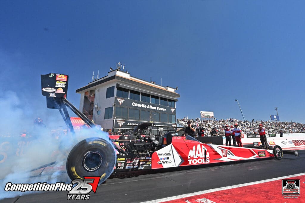 “We knew this was going to be a battle of attrition and dropped cylinders today,” Capps said. “A couple of those runs, there was no way I would imagine that would have got us lane choice, but it did. It was like a bracket car. This win reminded me a lot of my first win in St. Louis [1997] because it was hot and we had 150-degree track temps there and we dropped cylinders all day but still won the race.