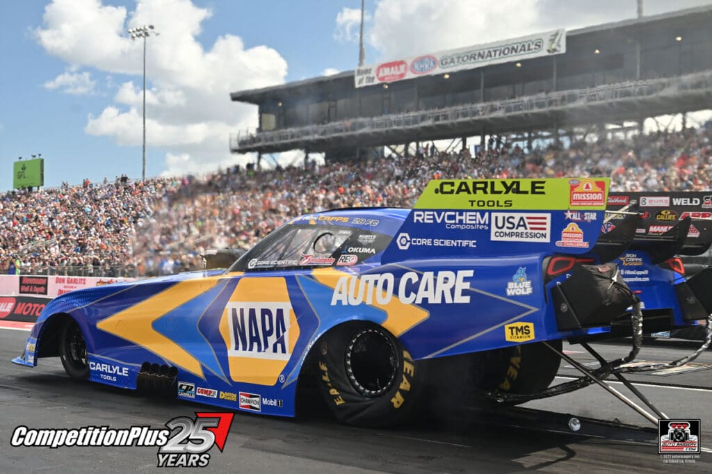In Funny Car, three-time NHRA champion Ron Capps delivered the quickest run of opening day with a 3.890-second pass at 334.07 mph under the lights. The run in his NAPA Auto Parts Toyota GR Supra was the only pass in the 3.80-second range. If the run holds through Saturday’s final two sessions, Capps would secure his 38th career No. 1 qualifier. The veteran driver is pursuing his fifth victory at Gainesville Raceway.