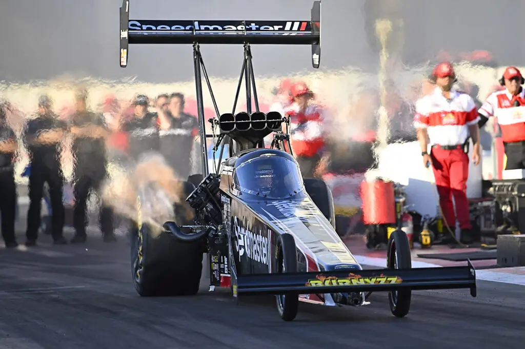 Kalitta returned to the track and reeled off a track-record speed of 339.74 mph. That eclipsed Brittany Force’s 338.94-mph mark from November 2022. (Clay Millican’s track elapsed-time record of 3.628 seconds from February 2018 remains intact.)