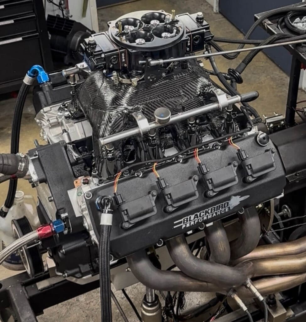 Inside, it’s a collection of racing hardware: Callies Magnum crank, Callies Ultra rods, Ross pistons, Jesel valvetrain, factory Mopar Drag Pak heads and one of the “Skunk Works” intakes that Blackbird has quietly been developing. “It’s a very radically different-looking Gen 3 intake,” Turk explained. “We tested it on an 830-horsepower engine, and it was better than the aluminum one we paid a thousand dollars for and two grand for porting. It was really designed for this, to turn 9,500 to 10,000 rpm.”