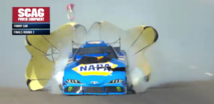 His NAPA Auto Care entry sashayed a bit on the suburban Phoenix racetrack before the engine detonated in a spectacular ball of flame, cracked the body, and veered into the right-side guard wall.