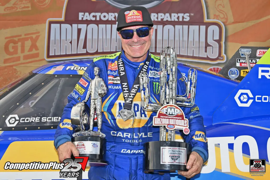 Ron Capps overcame a dramatic engine explosion earlier in eliminations to win Funny Car on Sunday at Firebird Motorsports Park, defeating Spencer Hyde in the final round of the 41st annual NHRA Arizona Nationals. Shawn Langdon (Top Fuel) and Dallas Glenn (Pro Stock) also secured victories as the NHRA Mission Foods Drag Racing Series completed its second race of the 2026 season.