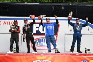 In Pro Stock, Anderson celebrated his 1,000th round win in the semifinals, then knocked off teammate Dallas Glenn with a run of 6.623, 205.91, in the finals. It was Anderson’s fourth victory of the season.