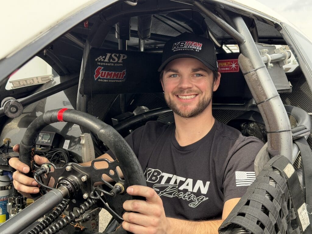 The team introduced Cody to the KB Titan Racing burnout car, a former championship chassis outfitted with a traditional Pro Stock clutch and shifter. Under the guidance of Dallas Glenn and later Dave Connolly, he progressed from controlled burnouts to full passes.