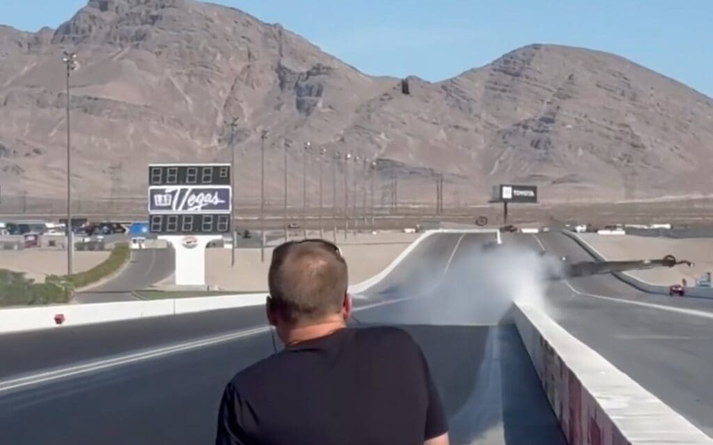 According to video of the incident, the run was to be a 330-foot hit. Just shy of that point, the dragster’s rear tires began to smoke, turning the car sharply right and sending it into and over the retaining wall. The dragster sustained significant damage, but Davies climbed out under his own power.