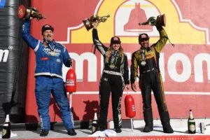 “This is just a big one. The last time I stood in the winner’s circle with (her father, John Force) was here and I wanted to win for him,” Brittany said. “This one is dedicated to him and everything he’s done over the last year. It’s been really tough and we’re so proud of him, and I’m just happy to have him out here. I need him out here with me. I knew we would get back to this winner’s circle, and I’m so proud of all these guys.