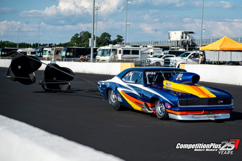 Richard Reagan, known for wheels-up passes in his screw-blown Mustang, qualified second with a 3.899 at 196.50. Points leader Blake Denton took the third spot at 3.926 at 194.86 in the “Bonnie” Camaro once piloted by the late Lizzy Musi.