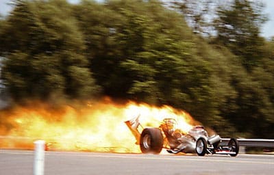 While warming up the car at the 1977 Pomona event, the throttle hung open. With no jack stands and his cowboy boot caught under the pedal, the Funny Car lunged forward — smashing into his van, another racer’s truck, and a Porta Potti.
