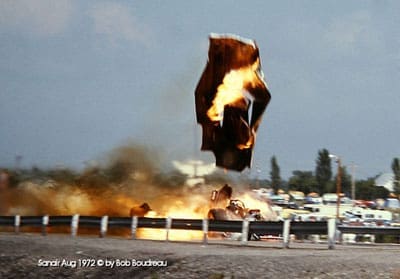 At the Le Grandnational in Quebec, his car erupted in flames after a round win over Al Hanna. The fire ignited the fuel tank vent, causing an explosion that engulfed the car. He suffered severe burns to his hands as the gloves’ stitching melted away.