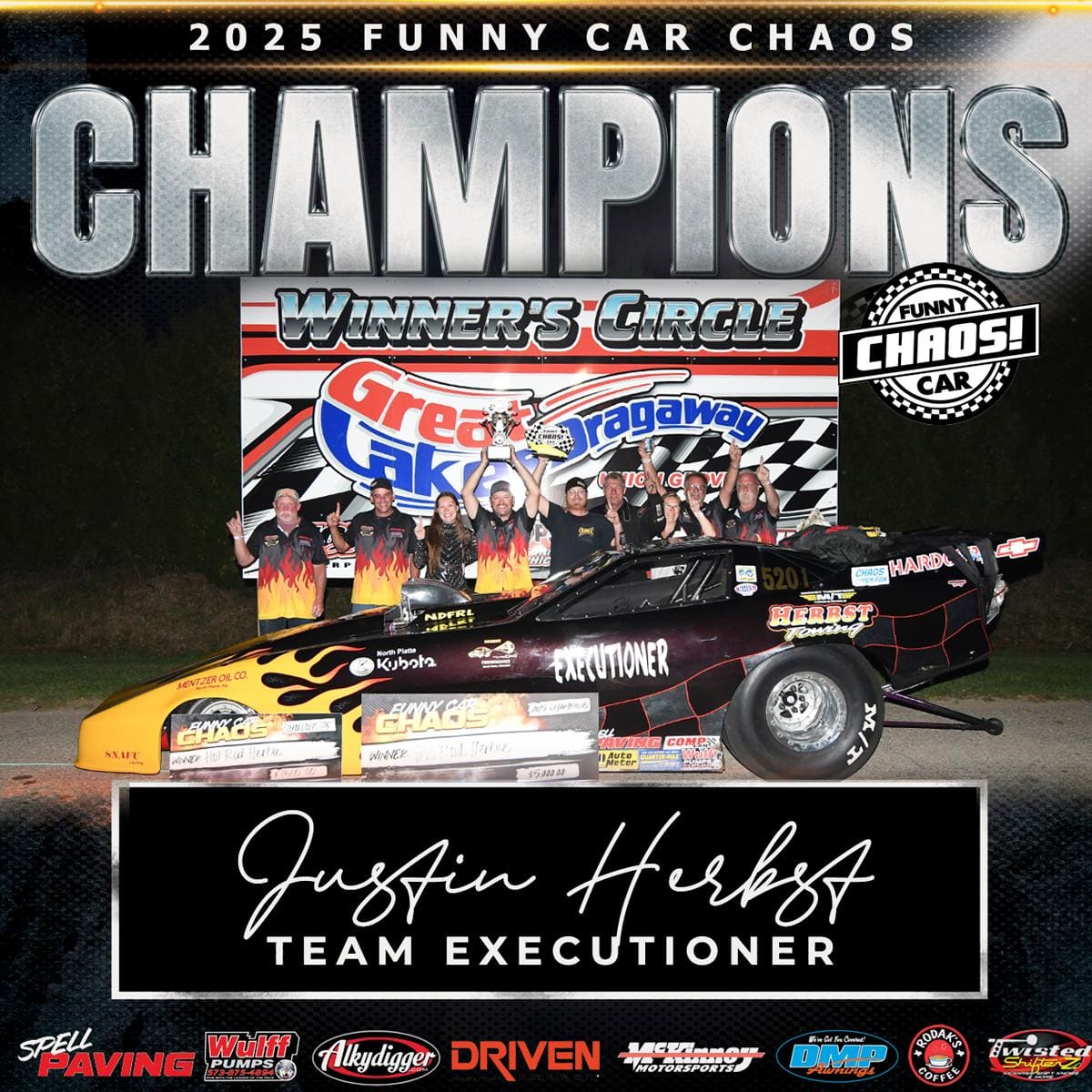 Justin Herbst captured the 2025 Funny Car Chaos championship Saturday night at Great Lakes Dragaway, closing a tense three-way battle that came down to the final round of the season. Herbst outlasted Keith Zimmerer and Brian Lewis to secure the title in front of a packed crowd.
