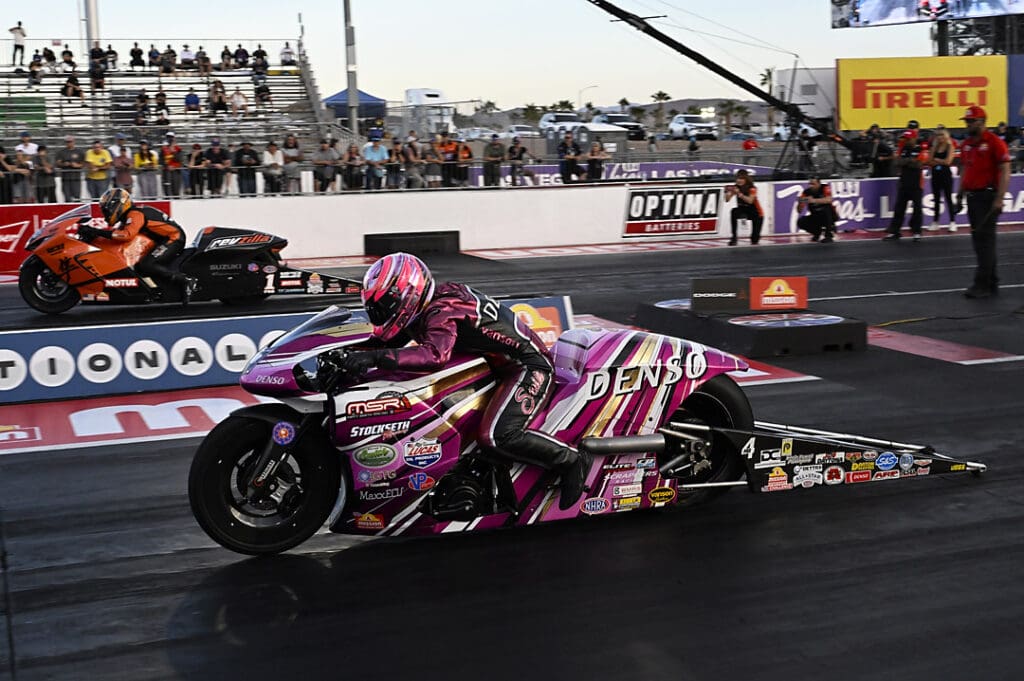The stakes at Pomona could not be higher. With the points margin unlikely to exceed 30, the championship could come down to a single, winner-take-all round between the Vance & Hines teammates. Herrera welcomes that possibility. “I honestly love it,” he said. “I feel like I do better under pressure. The last two seasons, I just had to win first round to clinch the championship. This year, it’s been different. Richard’s been on point — he’s probably got the best reaction time average in the class — but this has made me push myself more mentally.”