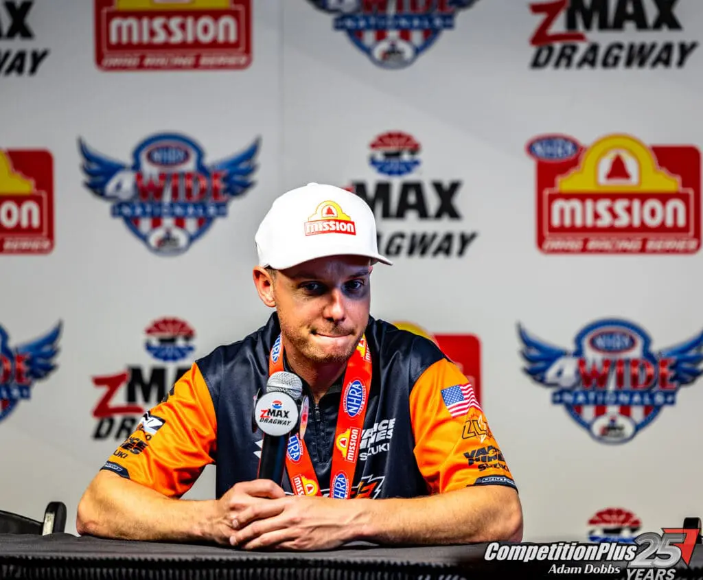 The two-time champion rode his Suzuki to a 6.759 at 199.20 and used a class-best .018 reaction time to defeat Matt Smith, Richard Gadson, and John Hall.