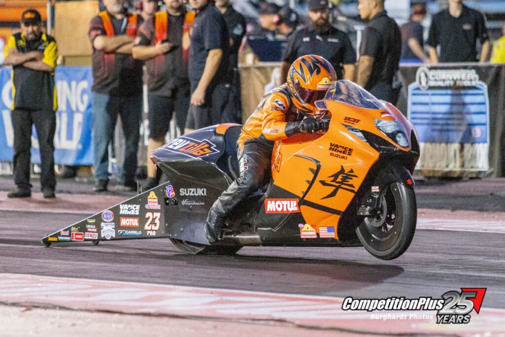 Pro Stock Motorcycle points leader Richard Gadson claimed the top spot under the lights with a 6.747 at 201.59 on his RevZilla/Motul/Vance & Hines Suzuki. Gadson was the quickest in both sessions, earning the $5,000 “JEGS Friday Night Live” bonus and potentially his second No. 1 qualifier of the year.