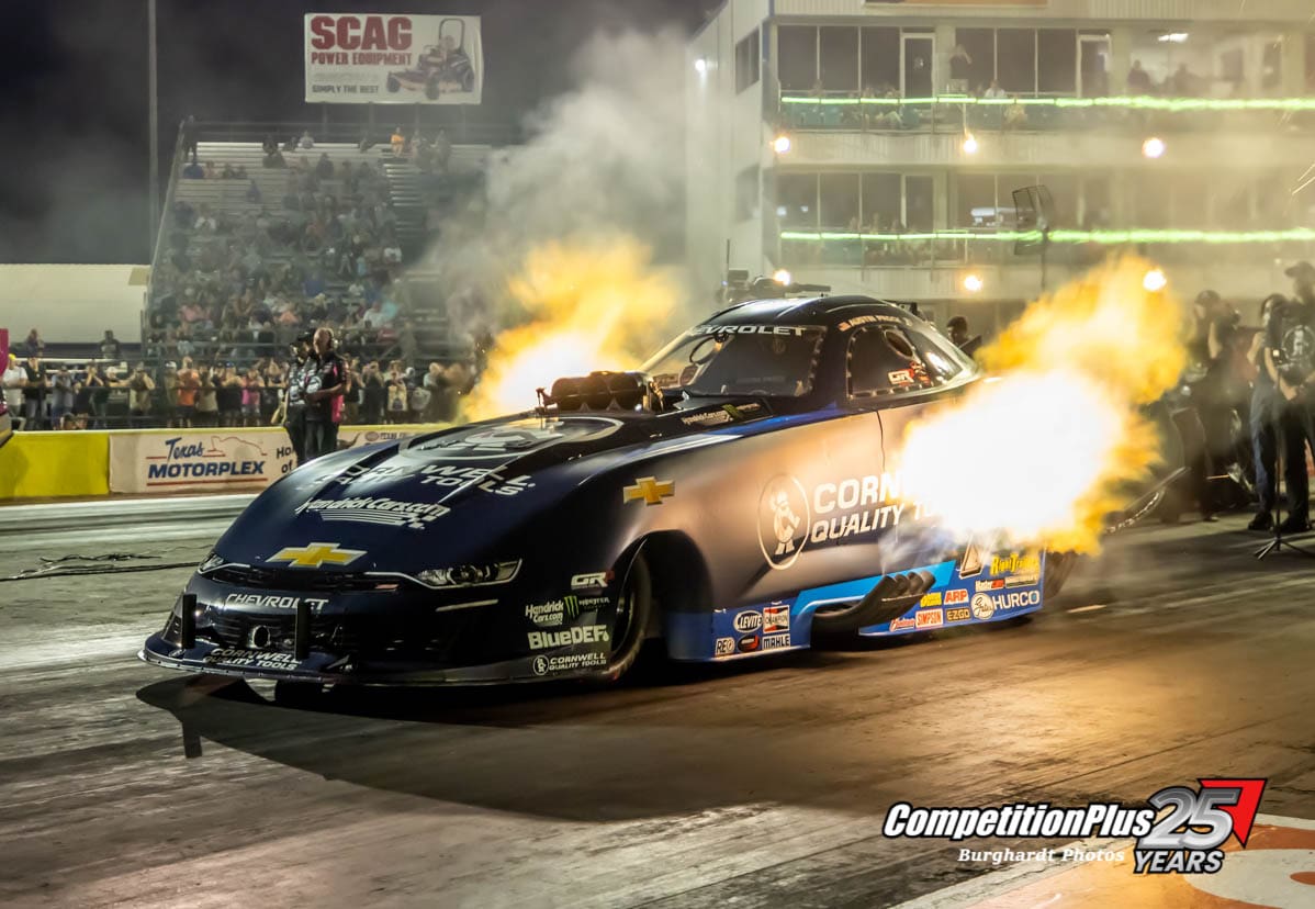 In Funny Car, reigning world champion Austin Prock swept both “JEGS Friday Night Live” and the “Battle for the Saddle,” cashing another $15,000 bonus after running 3.876 seconds at 336.07 mph in his Cornwell Tools Chevrolet SS.