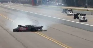 The Camaro then scrubbed the retaining wall with everything but the wheelie bar and right rear spill plates before coming to a stop. Just as important, Mike Thielen had shut off early in Lane 4 and was nowhere near the incident.