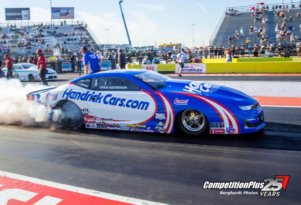 In Pro Stock, Greg Anderson held onto his No. 1 position from Friday with a 6.497, 209.88 mph in his HendrickCars.com Chevrolet Camaro. The six-time champion, who trails teammate Dallas Glenn in the standings, added two more strong passes Saturday and earned his seventh top qualifier of the season. Anderson will start eliminations against David Cuadra as he pursues his seventh win at Texas Motorplex.