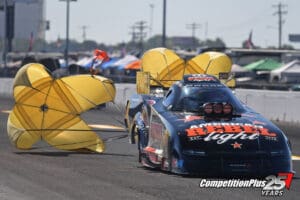 “We just have to be ready when they mess up, and we did that today. So proud of my guys for stepping up, rising to the occasion, putting a great racecar underneath me. I think Phil Shuler, my assistant crew chief, he’s back-to-back out here. I think he won here last year in a dragster, and won here in a Funny Car now, so this place has got a little good juju, and we’ll just hopefully keep carrying that forward. We got three races to go and it’s anybody’s ballgame right now.”