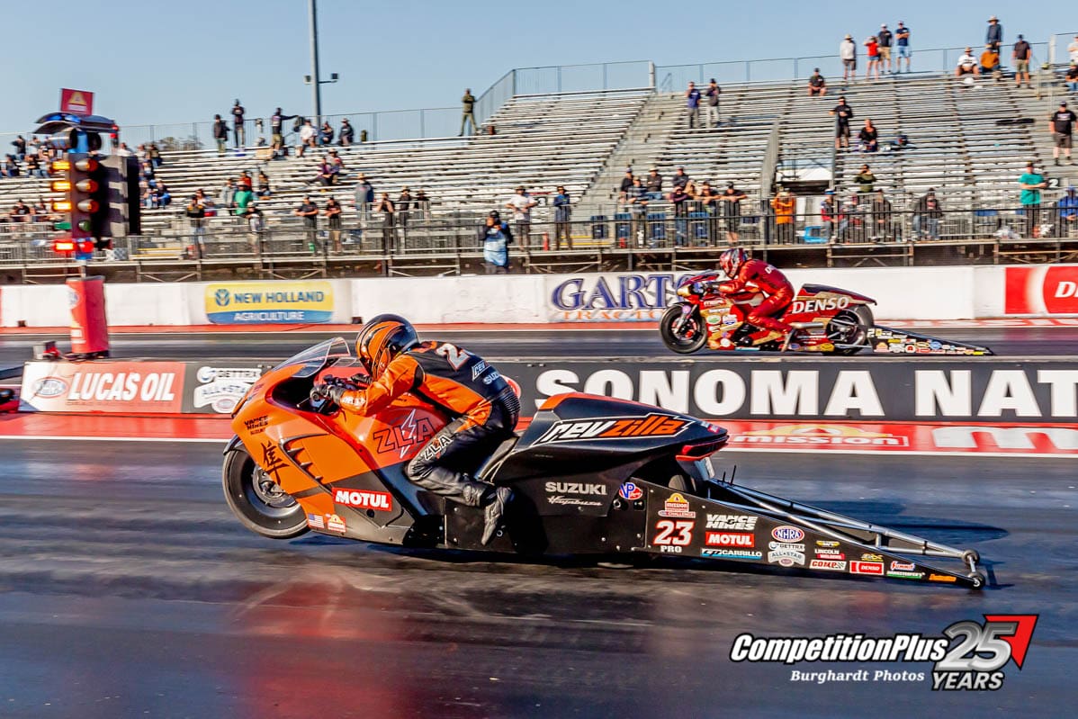 Despite the red-light loss, Gadson secured his first career No. 1 qualifier with Friday’s 6.702-second run at 200.77 mph on his RevZilla/Motul/Vance & Hines Suzuki.