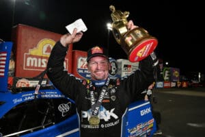 And while his teammate Austin Prock had a mean machine throughout qualifying and the first three rounds, it was Beckman, driving John Force’s PEAK Funny Car, in the end, who lifted the trophy in the air for the 35th time in his career.