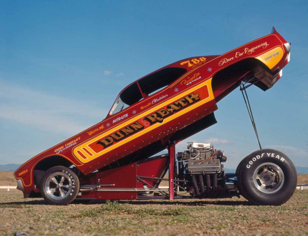 In 1972, Southern California’s Jim Dunn and Joe Reath debuted a red rear-engine Hemi-Cuda that beat the odds and the field. Dunn, a bruiser from the Fuel Altered and Top Fuel trenches, manhandled the car to win the NHRA Supernationals at Ontario—still the high-water mark for rear-engine Funny Cars in big-league drag racing.
