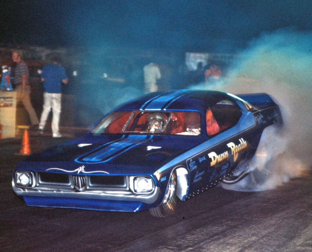 The most successful rear-engine Funny Car ever. Dunn and Reath’s red 1972 Hemi-Cuda won the NHRA Supernationals and starred in Funny Car Summer. A sleeker 1973 version suffered handling issues and was parked in favor of a conventional Plymouth Satellite.