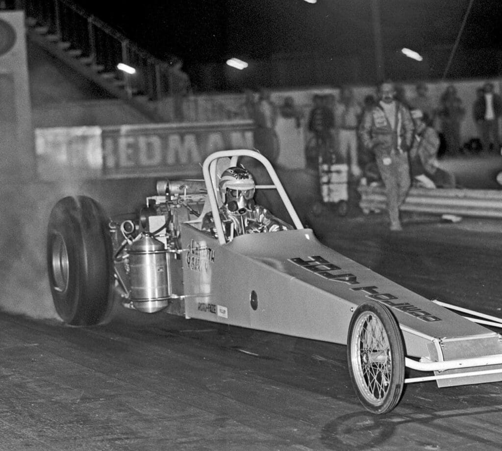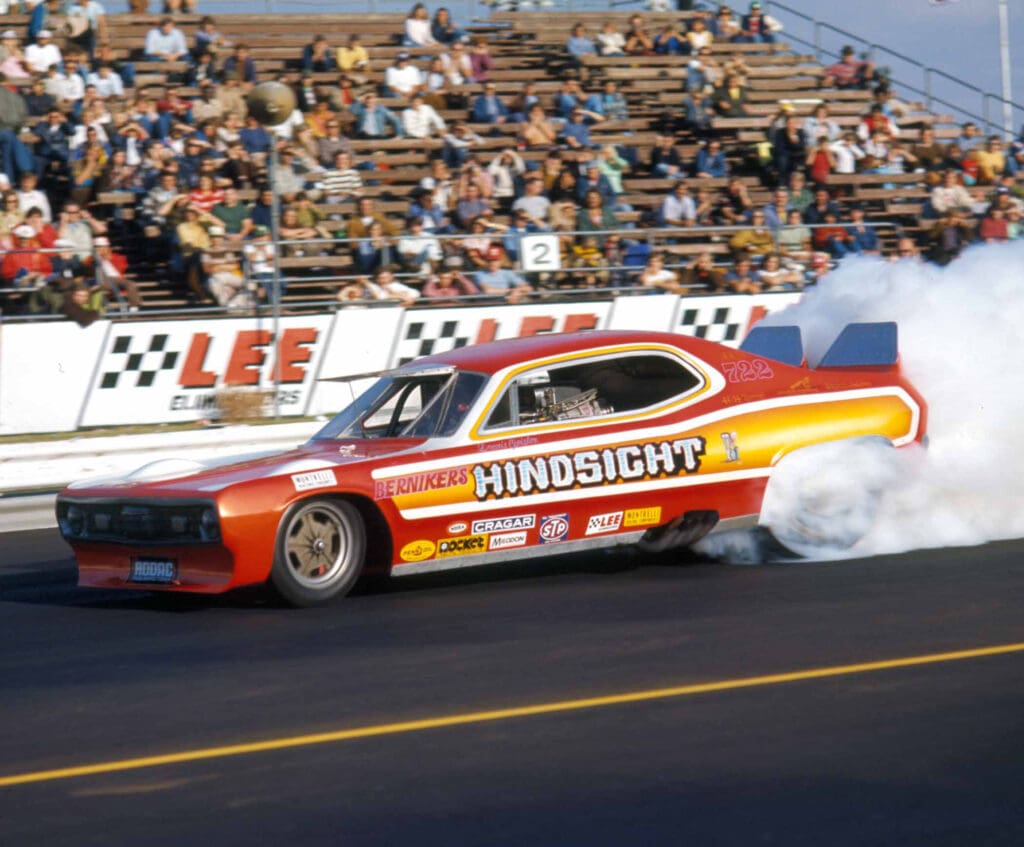 Berniker’s Hindsight lasted several seasons before Dennis Geisler put it into a backflip at the 1975 Winternationals. Geisler walked away; the car was totaled.
