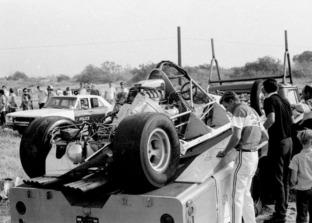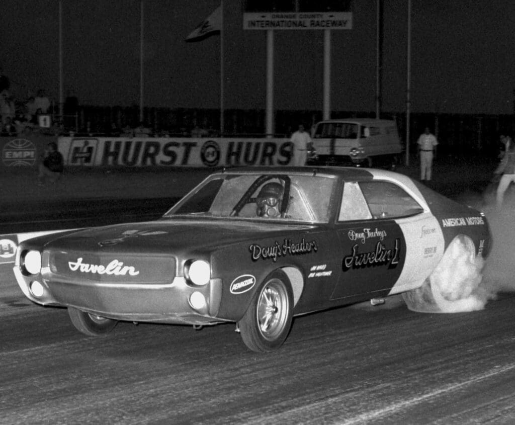Doug Thorley sold his championship Corvair to the Pisano Bros. and rolled out a rear-engine AMC Javelin. Bob Hightower drove it until it took flight at Irwindale in 1969. Hightower climbed out unhurt, but Thorley retired the “flying Javelin” on the spot.