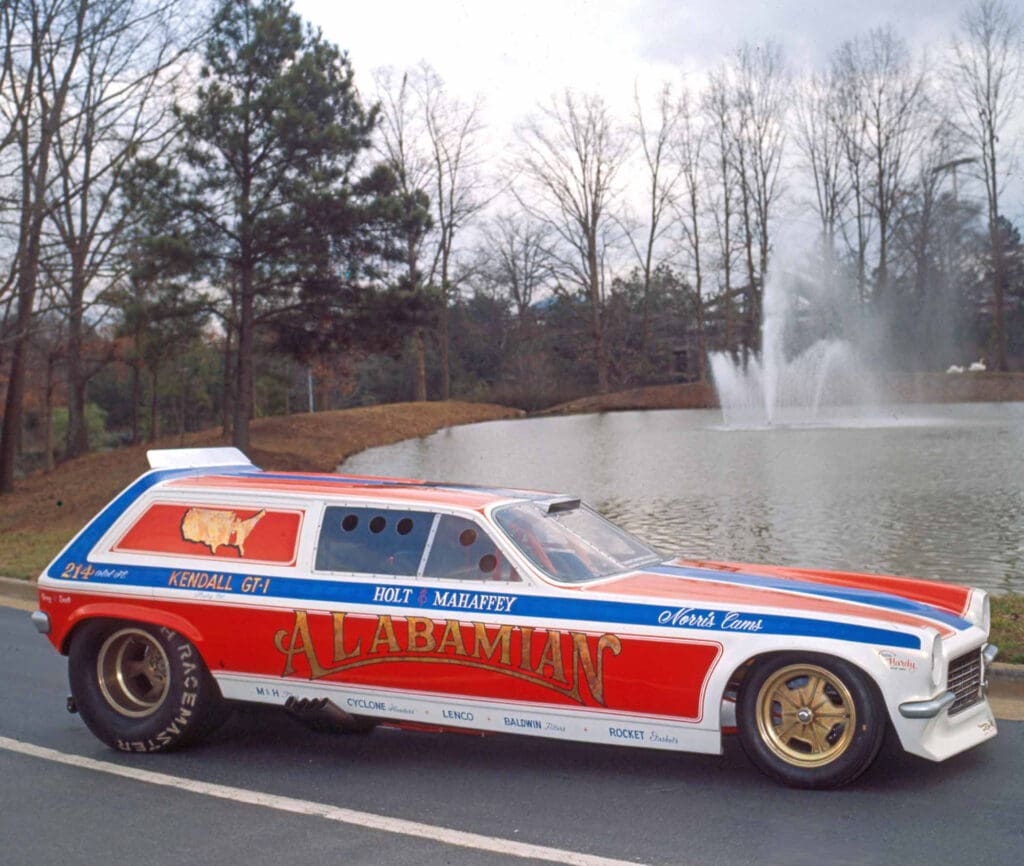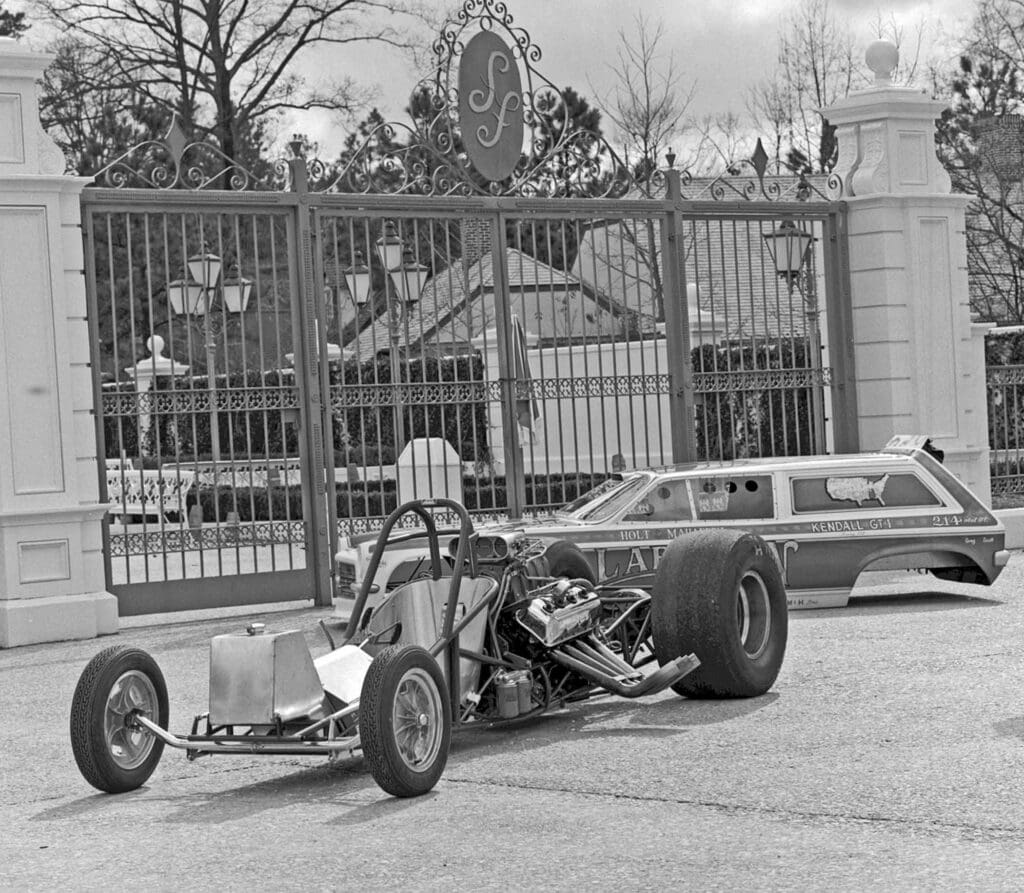 One of the last rear-engine Funny Cars of the era, the sidewinder AMC Gremlin crashed at Irwindale with Bob Hightower driving. Hightower survived, but the car was destroyed. Other rear-engine entries lost to crashes included Larry Derr’s AMC Javelin, Gary Gabelich’s Vega panel, and Larry Fullerton’s Trojan Horse, which never reached the track.