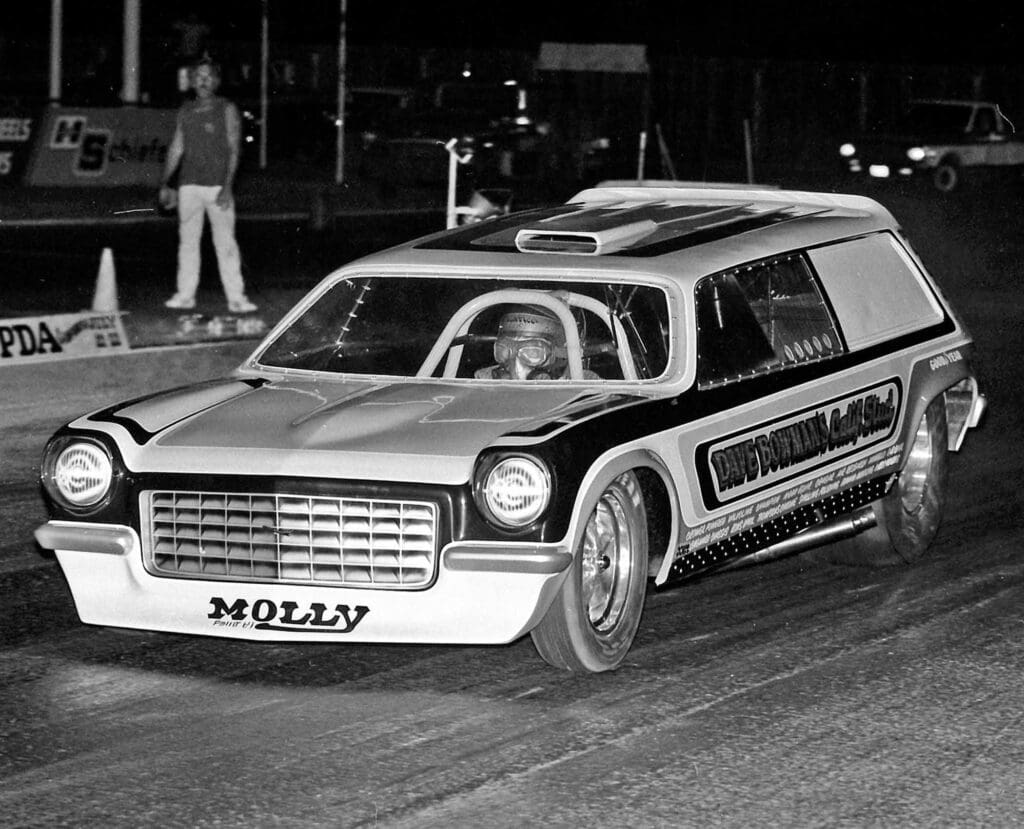 Dave Bowman’s rear-engine California Stud Vega panel ran strong, finishing runner-up to Danny Ongais at the 1972 OCIR PDA race—the best finish for a rear-engine Funny Car in major SoCal competition. It later became a sand racer.