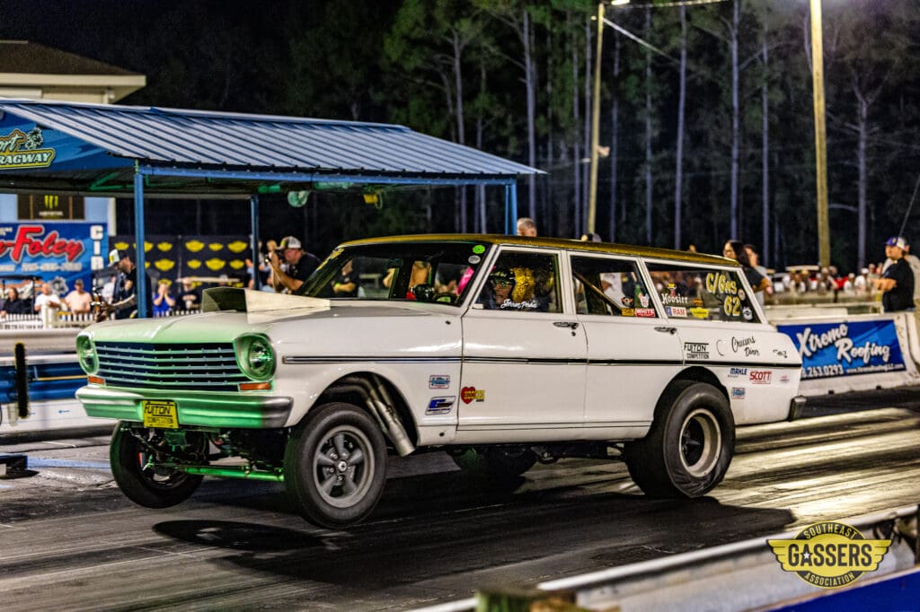 C/Gas featured the largest field of the event with 18 cars and a champion already decided. Jerren Perdue had locked up the C/Gas championship in his “Ghost of Fulton’s Past” Chevy II wagon one race earlier in Gulfport, Mississippi. His season included four wins and a class record of 5.95 seconds.