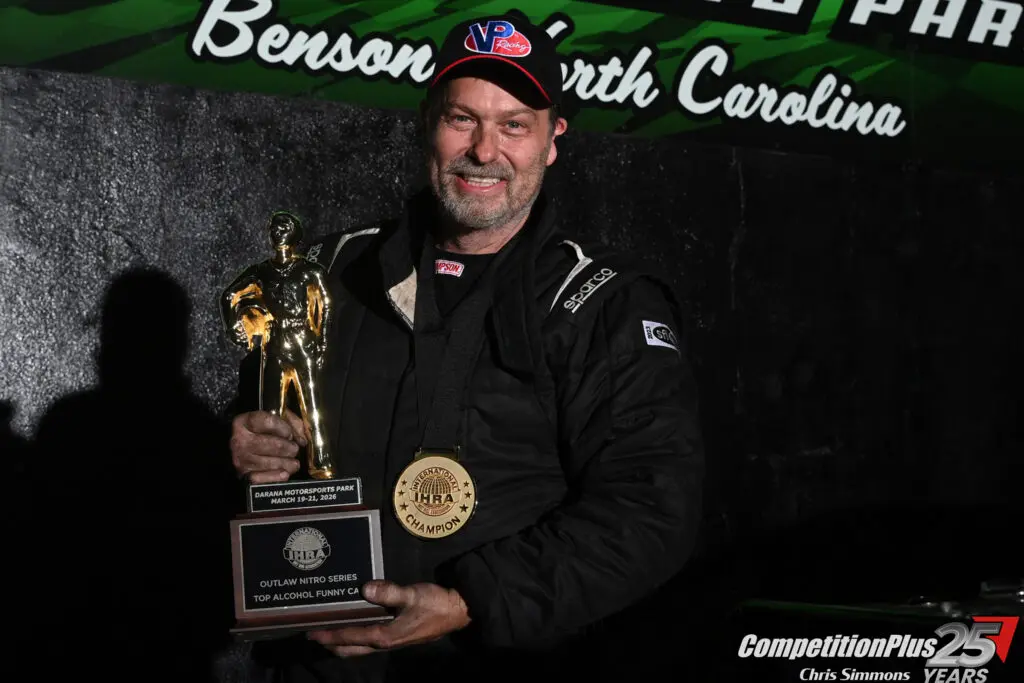 Bruce Mullins knows exactly where his motivation to return to Top Alcohol Funny Car originated. Moments after securing victory at the IHRA Outlaw Nitro Series season opener at Darana Motorsports Park in Dunn, N.C., he made sure the answer was unmistakable.