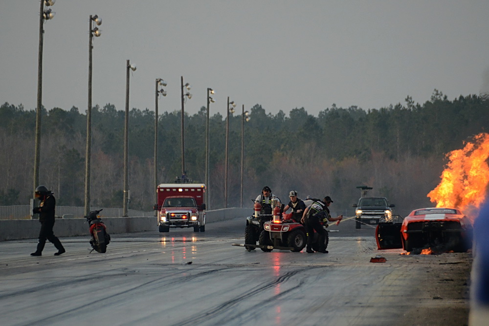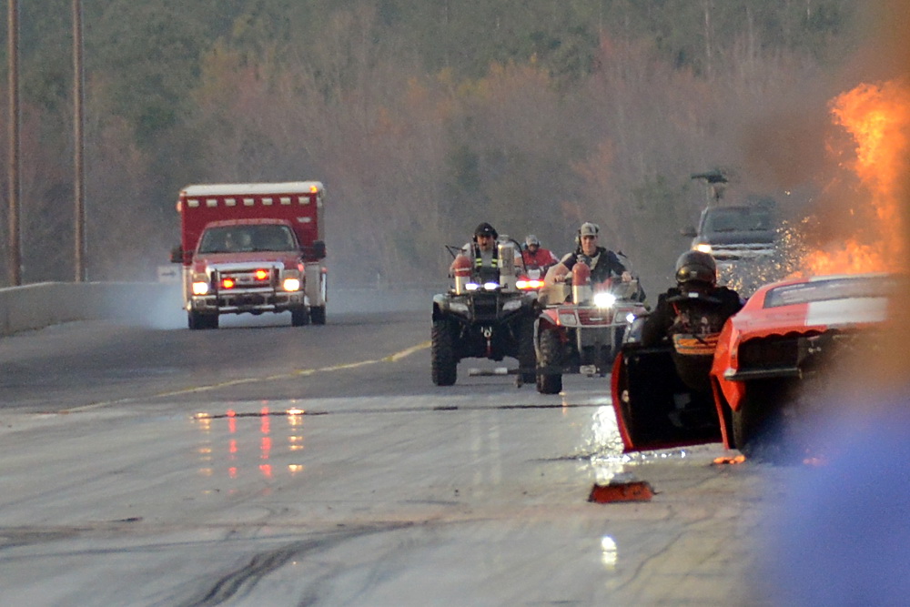 “I could see fire under the hood scoop, so I pulled the pin on the fire extinguisher and went to pull the handle, but it didn’t come out. So I pulled harder and it bent the bracket, so I reached over with my other hand, too, to grab the bracket, but it still wouldn’t come out. So that’s when I decided to just bail out of the car. It was all very calm, though. Almost like slow motion, never any panic,” he said.