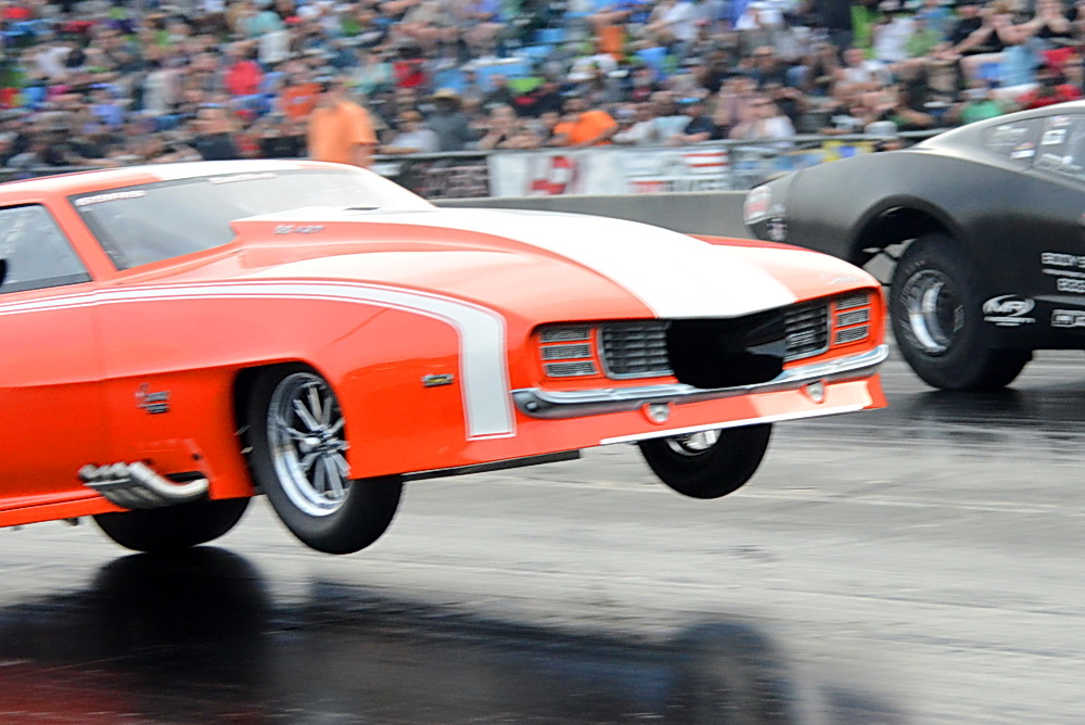 While running in the right lane against Norm Bryson’s Corvette, Sullivan left first with an excellent .003 reaction time, but by the time he was about 200 feet out, the nose of his orange Camaro started rising skyward until Sullivan pedaled and brought the car back on track in a shower of sparks.