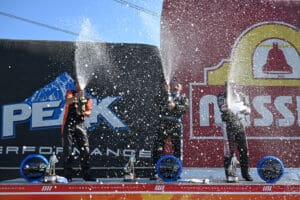 “I came out to this race last year to see my buddy Chris King drive his nitro Funny Car, and I sat in the grandstands up there and I enjoyed the race,” Beckman admitted. “I had no concept I’d be back sitting inside John Force’s car getting the trophy and seeing you guys from the podium up here. It’s beyond words.”