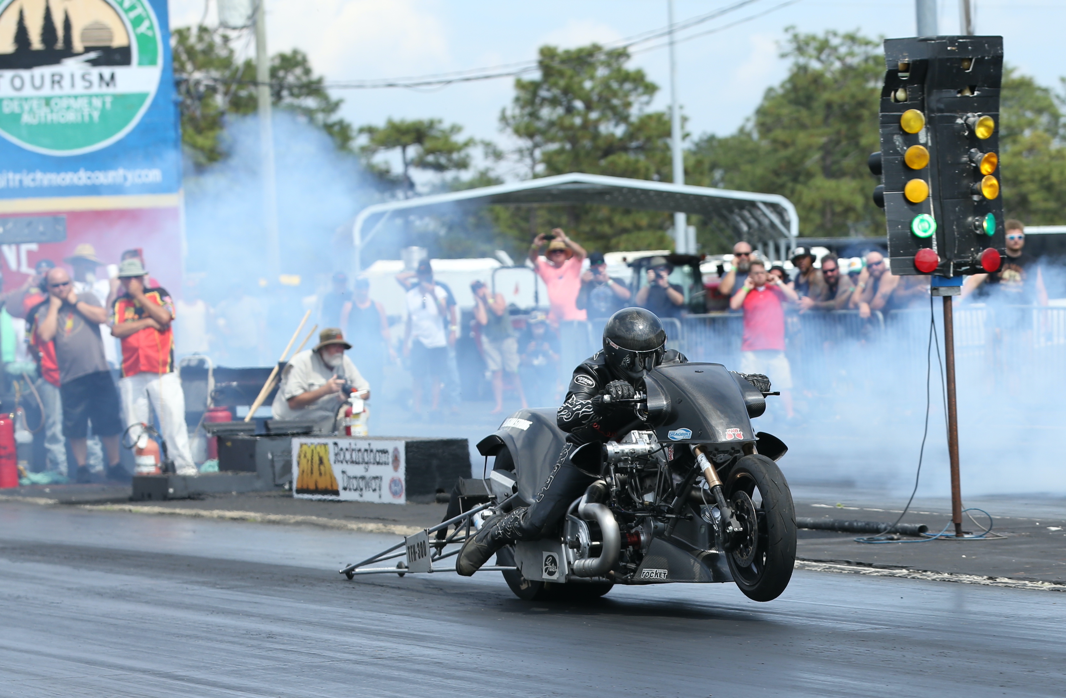 Scariest incident: “The toughest thing was on my V-Rods. Once we started sub-9.50s the bike would go into ‘tank slap,’ where the front end starts shimmying so bad you can barely hang on to it. Had it happen here at Rockingham and once at Norwalk. … We joked about it because I was new to the nitro thing, I was still riding the V-Rod and had that incident. I came back and said, ‘I never thought I’d feel safer on my nitro bike.’